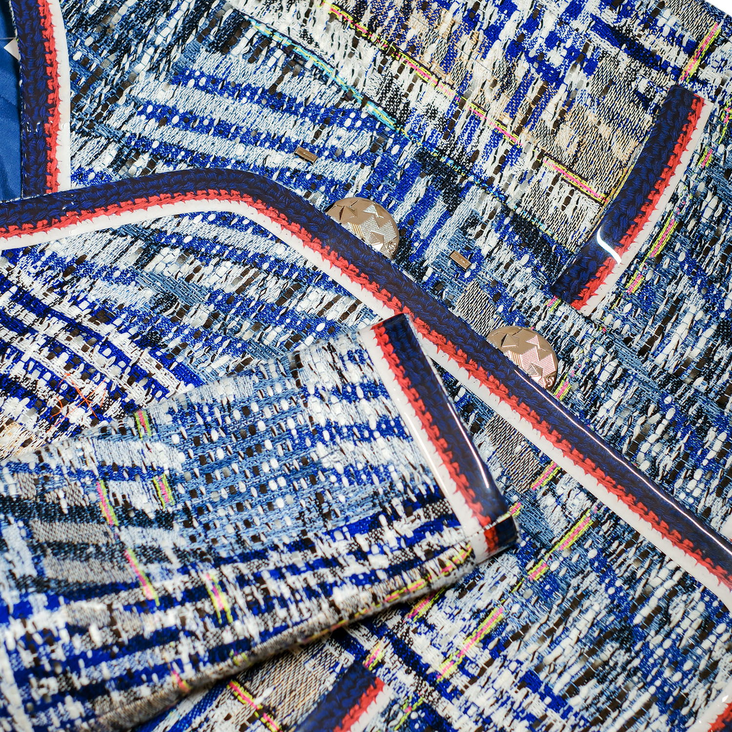 The jacket is meticulously crafted from an acrylic-blend "fantasy tweed" in a striking blue and multi-color pattern. It features a tailored, double-breasted silhouette with a chic collarless design and elegant red and white trim accents that highlight its sophisticated architecture.