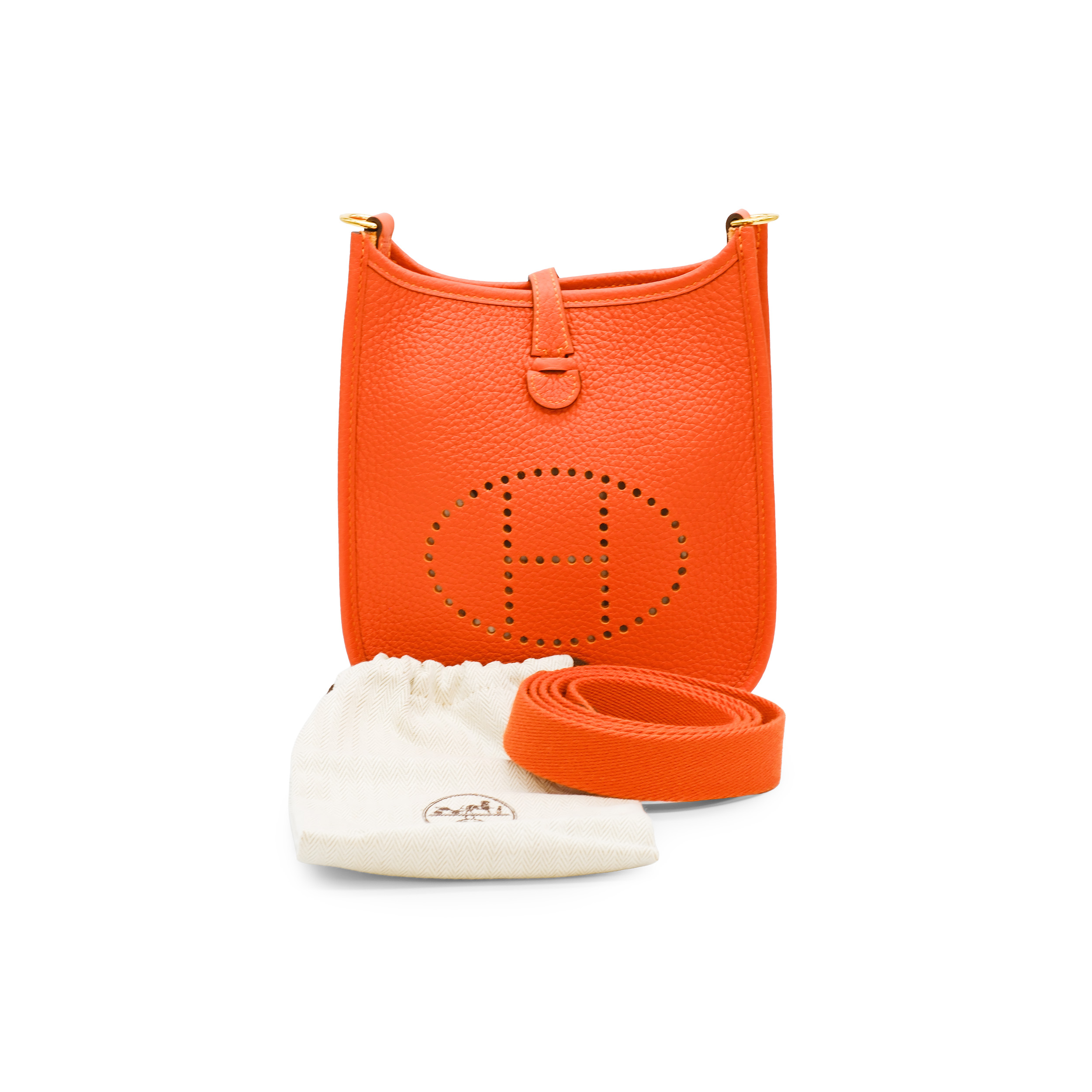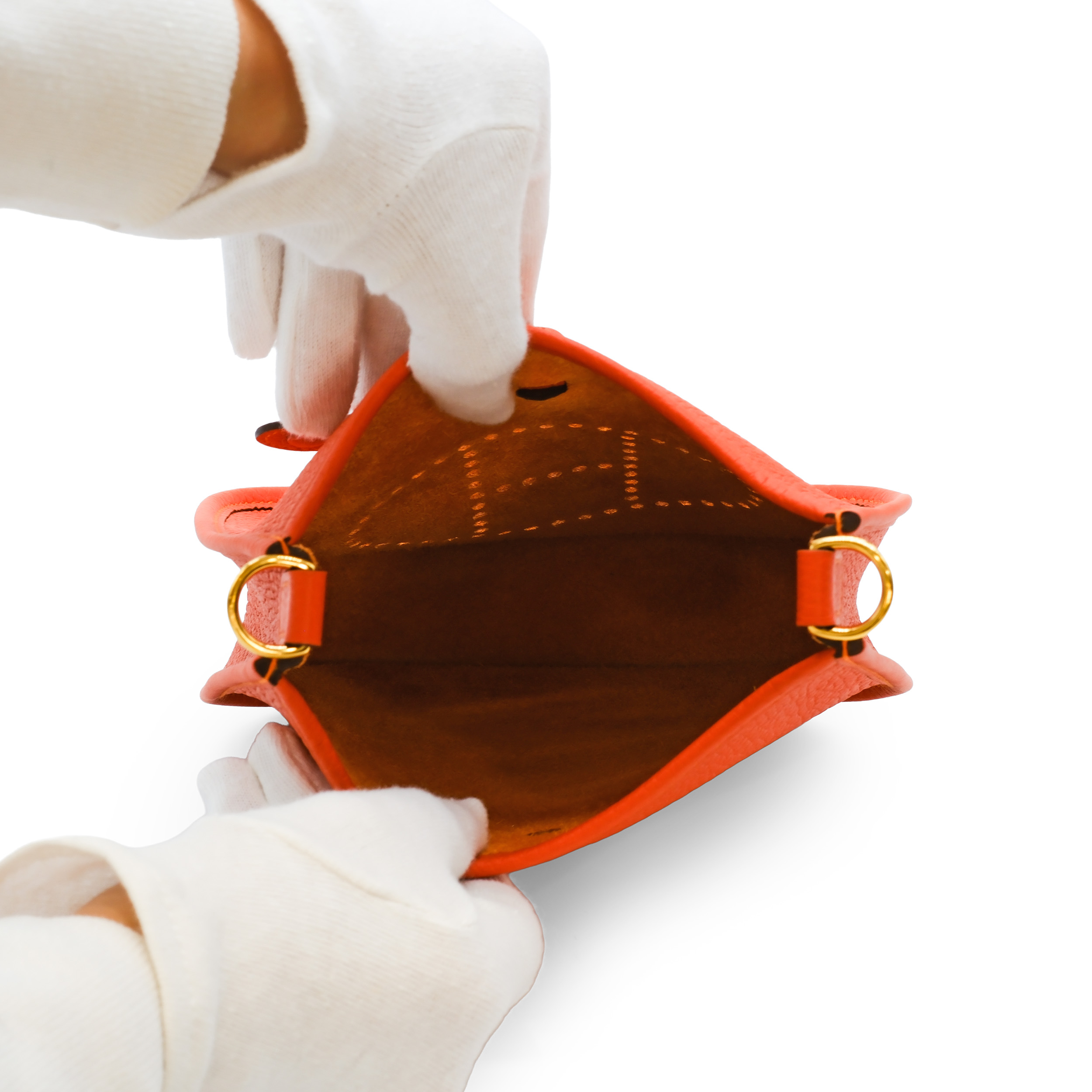 Magnificent Hermès Mini Evelyne shoulder bag in orange Clémence taurillon leather, gold metal fittings, removable orange canvas shoulder strap allowing it to be worn over the shoulder or across the body. Snap button closure. Interior in orange suede.