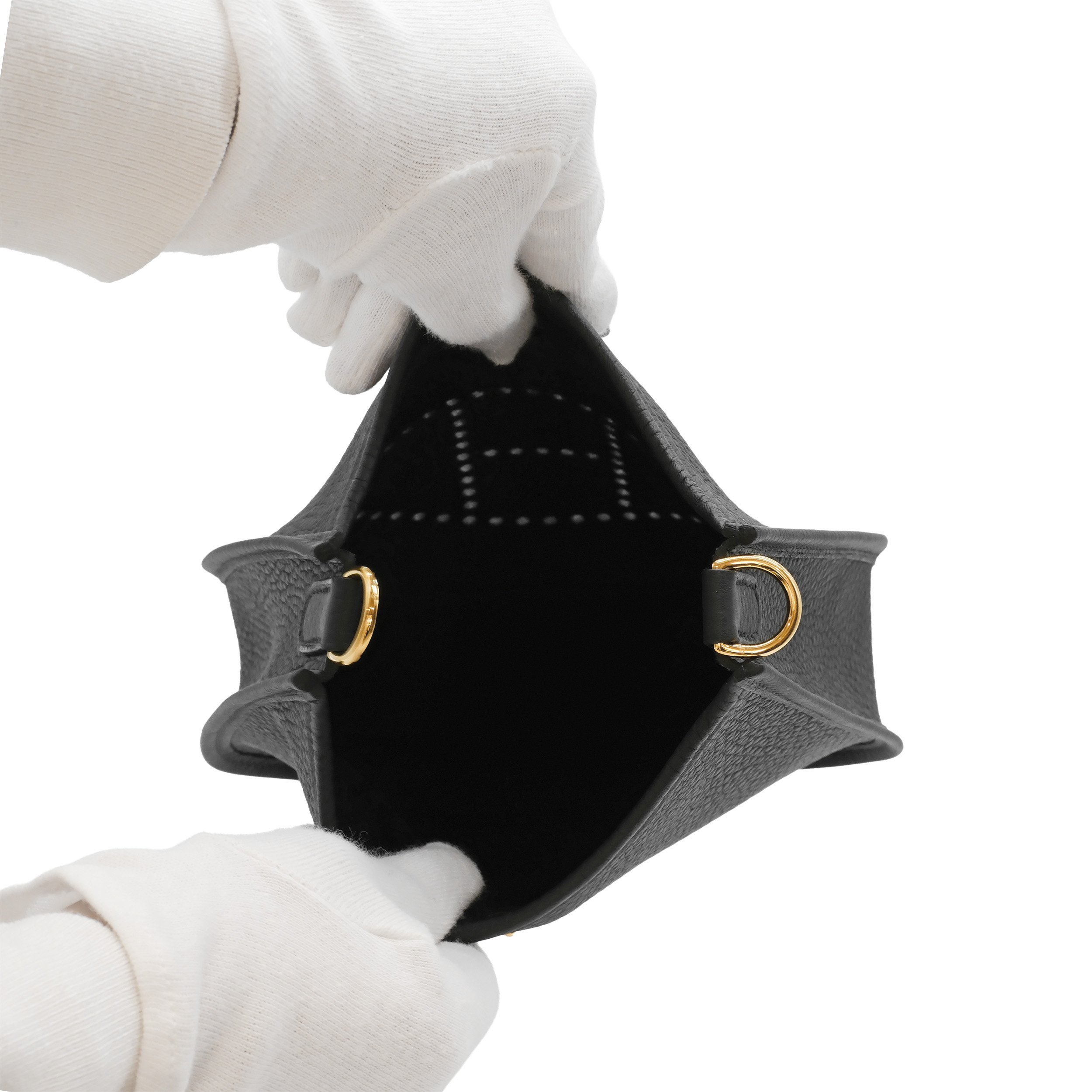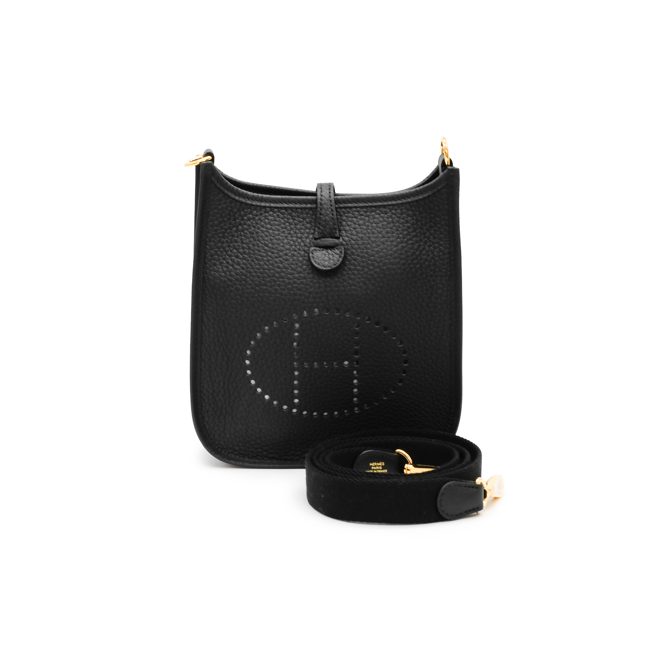 This petite crossbody messenger bag is finely crafted of black togo leather. The bag features a canvas body strap, polished gold hardware, and a perforated Hermes H inside an oval on the front of the bag. The top of the bag opens with a crossover strap to a matching suede interior.