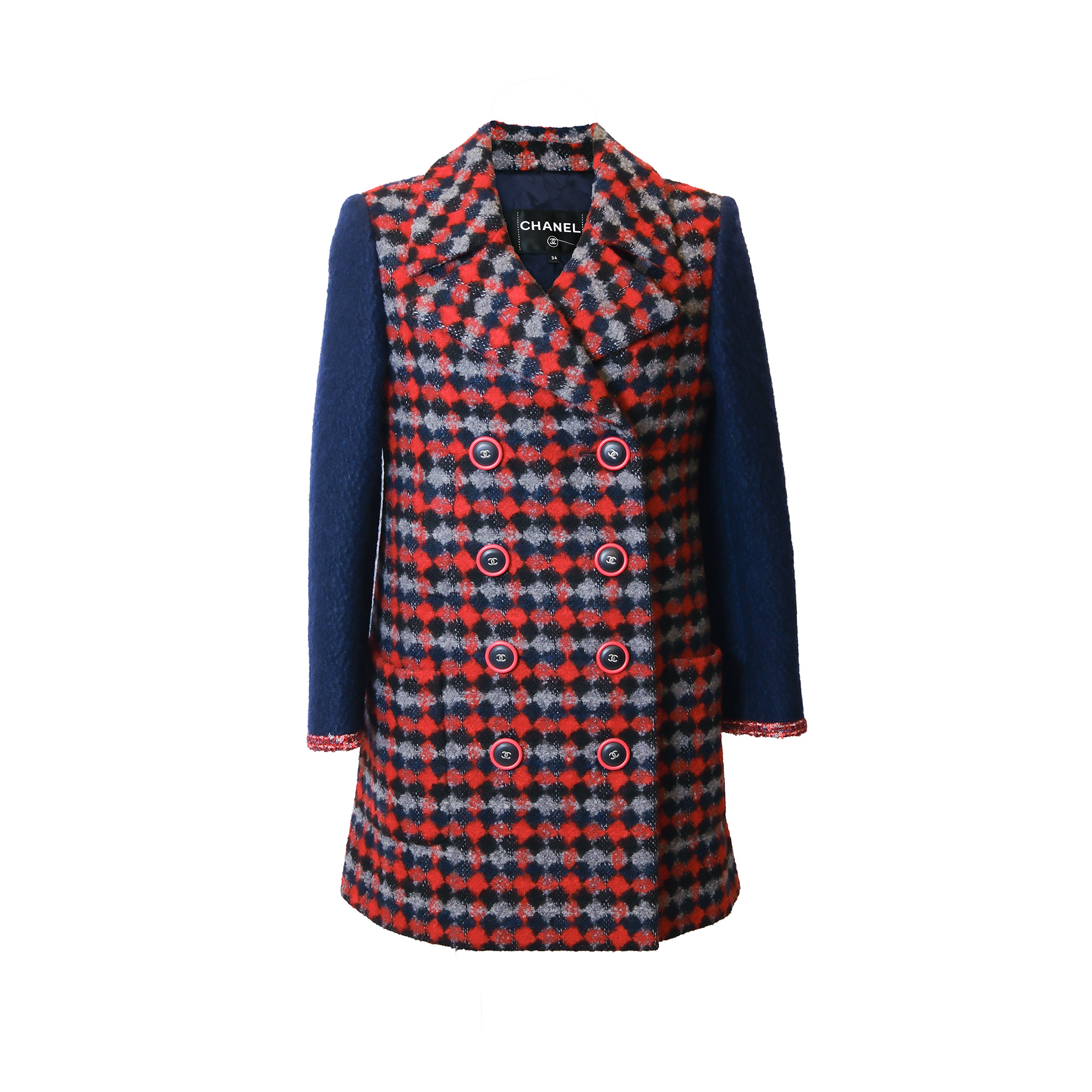 Exude modern Parisian elegance with this striking Chanel double-breasted coat. A true collector’s piece, this garment showcases a sophisticated interplay of color and pattern, blending traditional craftsmanship with a contemporary, graphic edge.