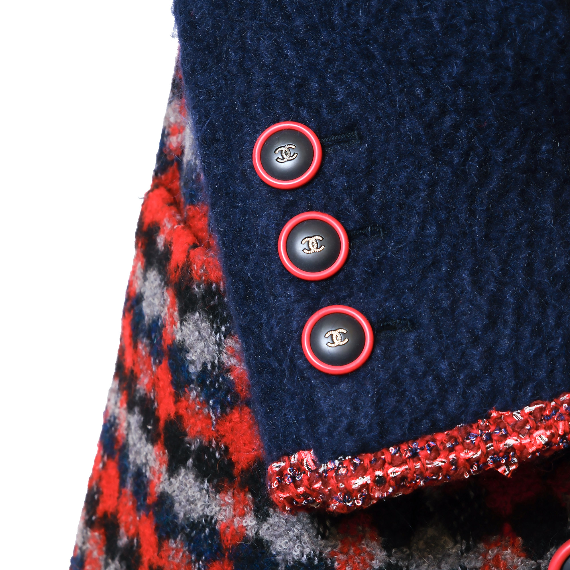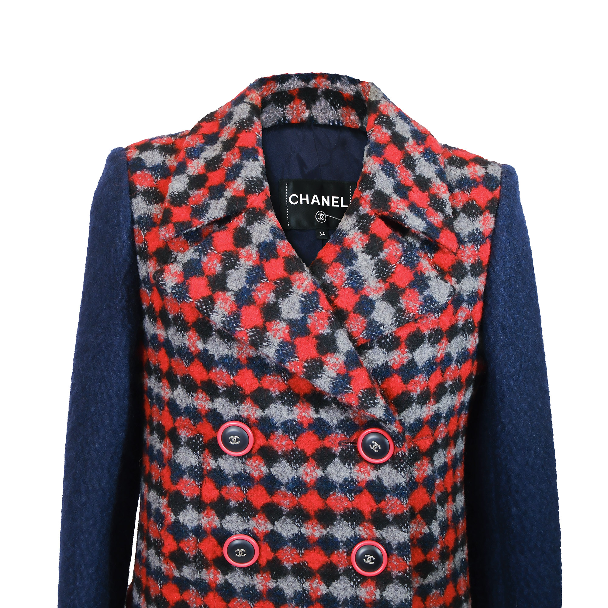 The body is meticulously crafted from a multi-dimensional houndstooth tweed in a vibrant palette of cherry red, slate gray, and navy blue. In a signature Chanel twist, the coat features contrast solid navy wool sleeves, creating a sleek, structured silhouette that draws the eye. The piece is anchored by eight statement CC-logo buttons in a matching red finish, adding an unmistakable touch of luxury to the double-breasted closure.