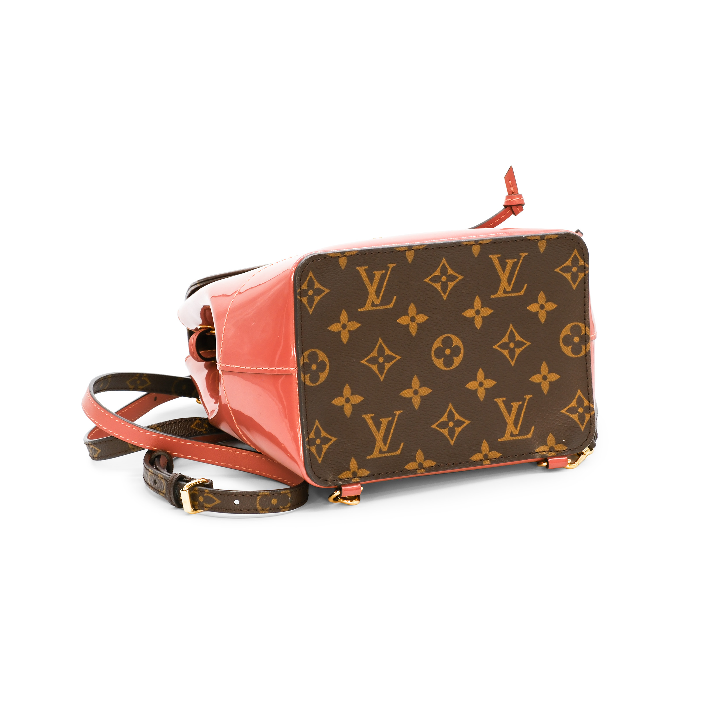 This Louis Vuitton Hot Springs backpack is sure to turn heads wherever you go. Crafted from monogram canvas with pink patent leather trim, the backpack features detachable shoulder straps that can be carried by the top handle alone. The gold-tone brass snap closure opens to reveal a spacious interior.