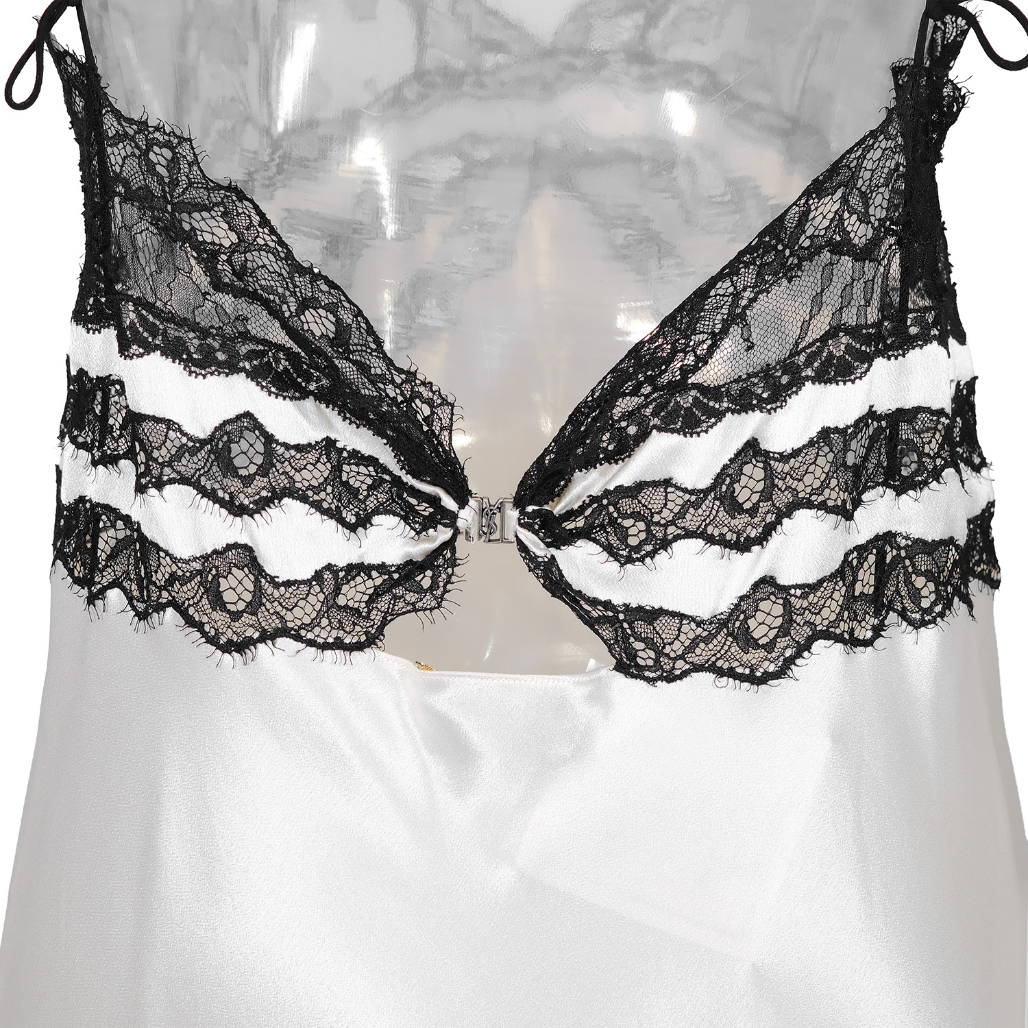 Elevate your wardrobe with this iconic Saint Laurent midi slip dress, a masterpiece of romantic, lingerie-inspired design. Crafted from lustrous 100% silk-satin in a sophisticated cream/off-white hue, this rare find features delicate, sheer black lace that beautifully defines the deep V-neckline, stripes the empire waist, and elegantly finishes the hem.