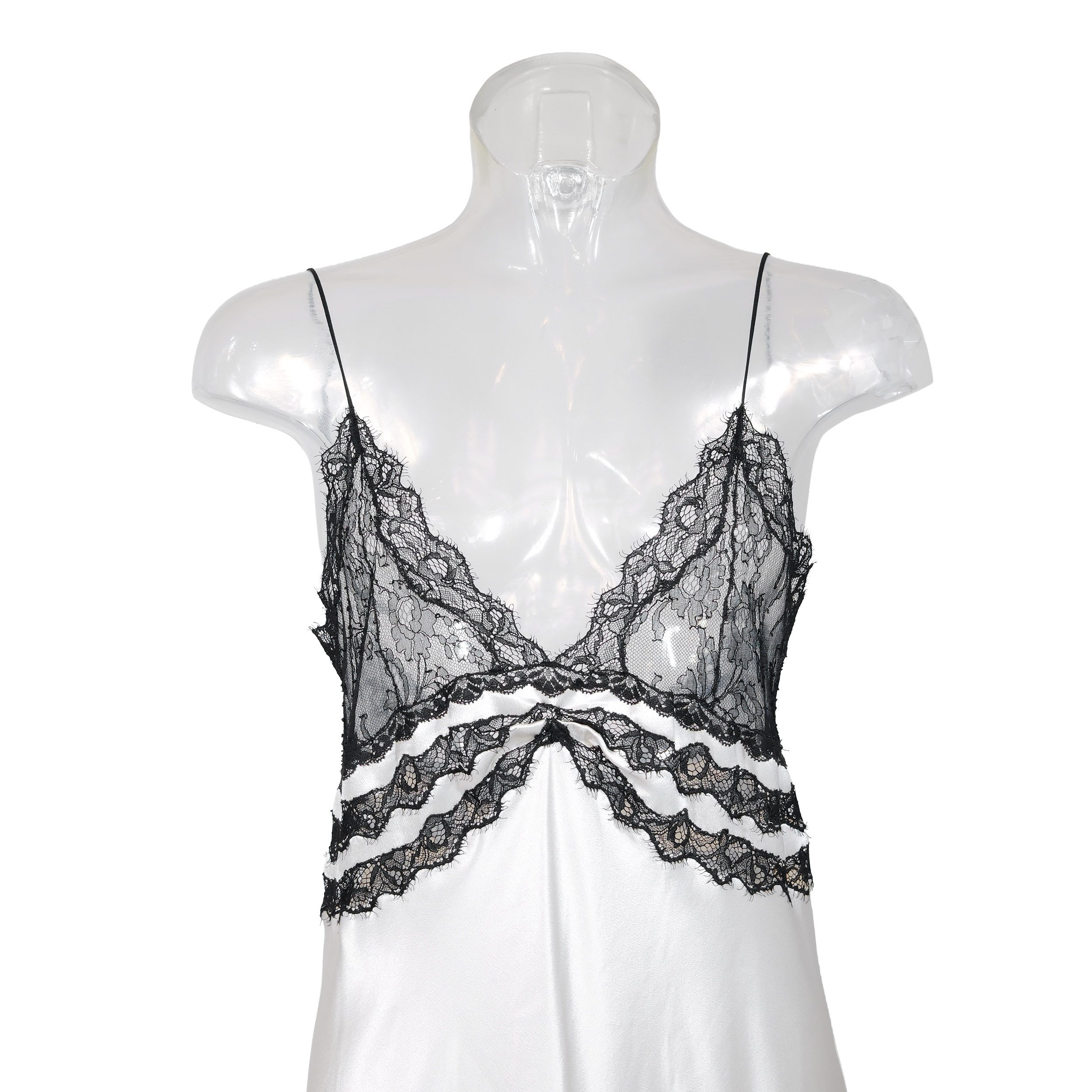 Details: Delicate spaghetti straps, rear keyhole with hook-and-eye closure, and intricate lace panelling