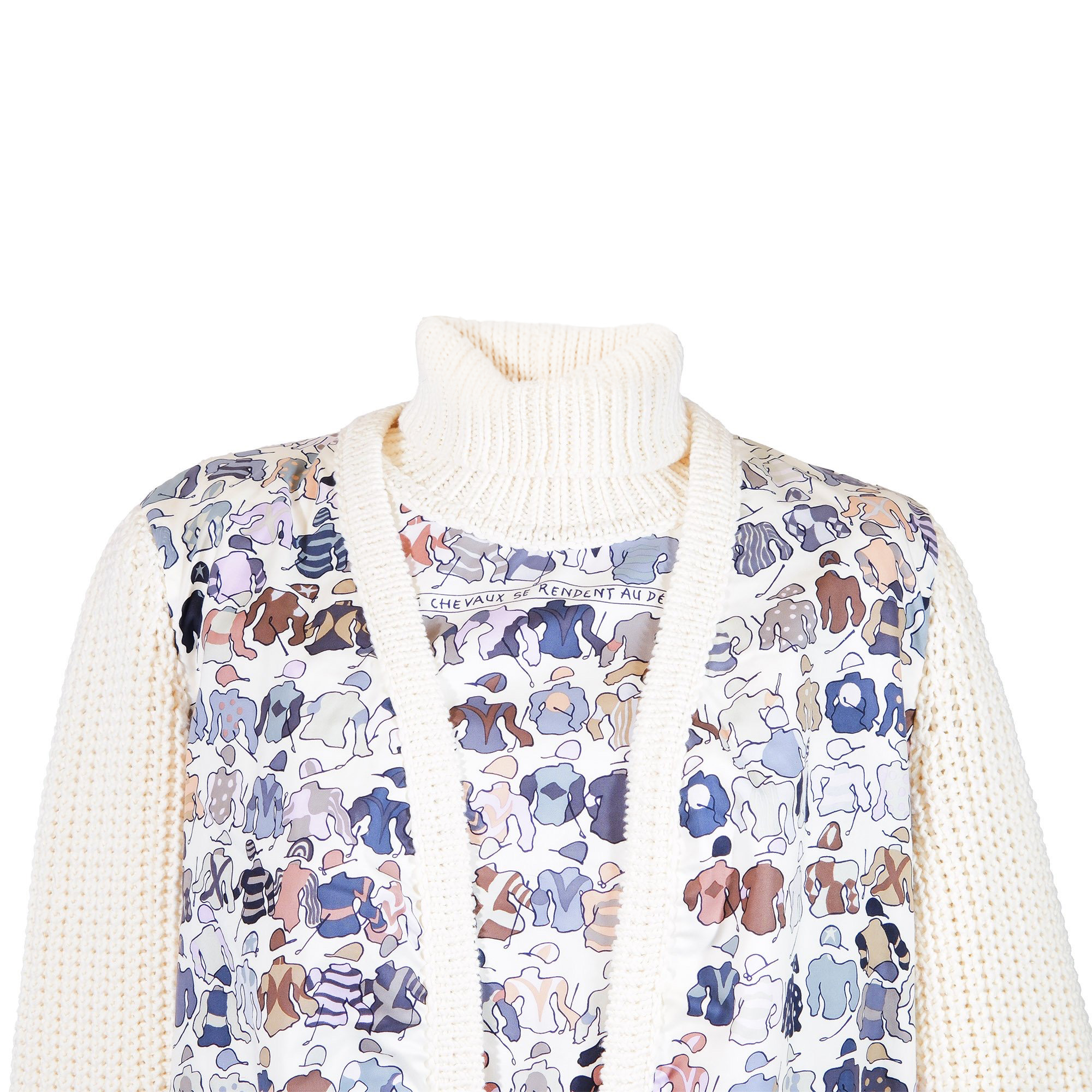 Own a piece of fashion history with this iconic Hermès twinset, featuring the whimsical and rare "Les Chevaux Se Rendent Au Départ" (The Horses Go to the Start) motif. This vintage ensemble consists of a sleeveless turtleneck shell and a matching long-sleeve cardigan, both showcasing the signature Hermès silk front panels paired with high-quality knitwear.
