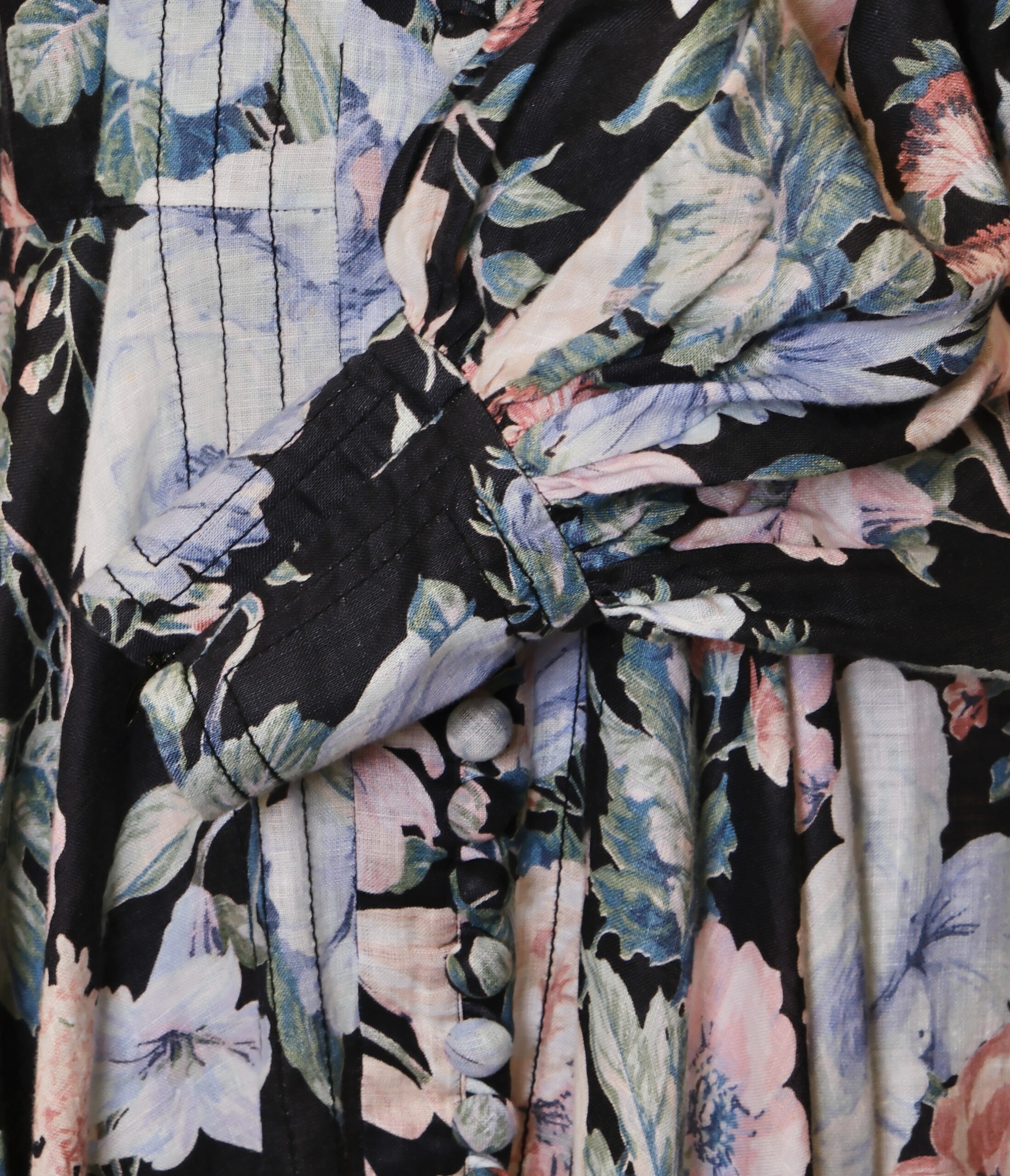 The dress is expertly crafted from 100% premium linen, featuring a soft, muted floral print in shades of pink and blue set against a striking black background. It is defined by its architectural blouson sleeves with elongated buttoned cuffs and a sophisticated mandarin high neckline. The bodice features a row of fabric-covered rouleau buttons and vertical pleating that leads into a playful A-line mini skirt, creating a perfectly balanced and feminine silhouette.