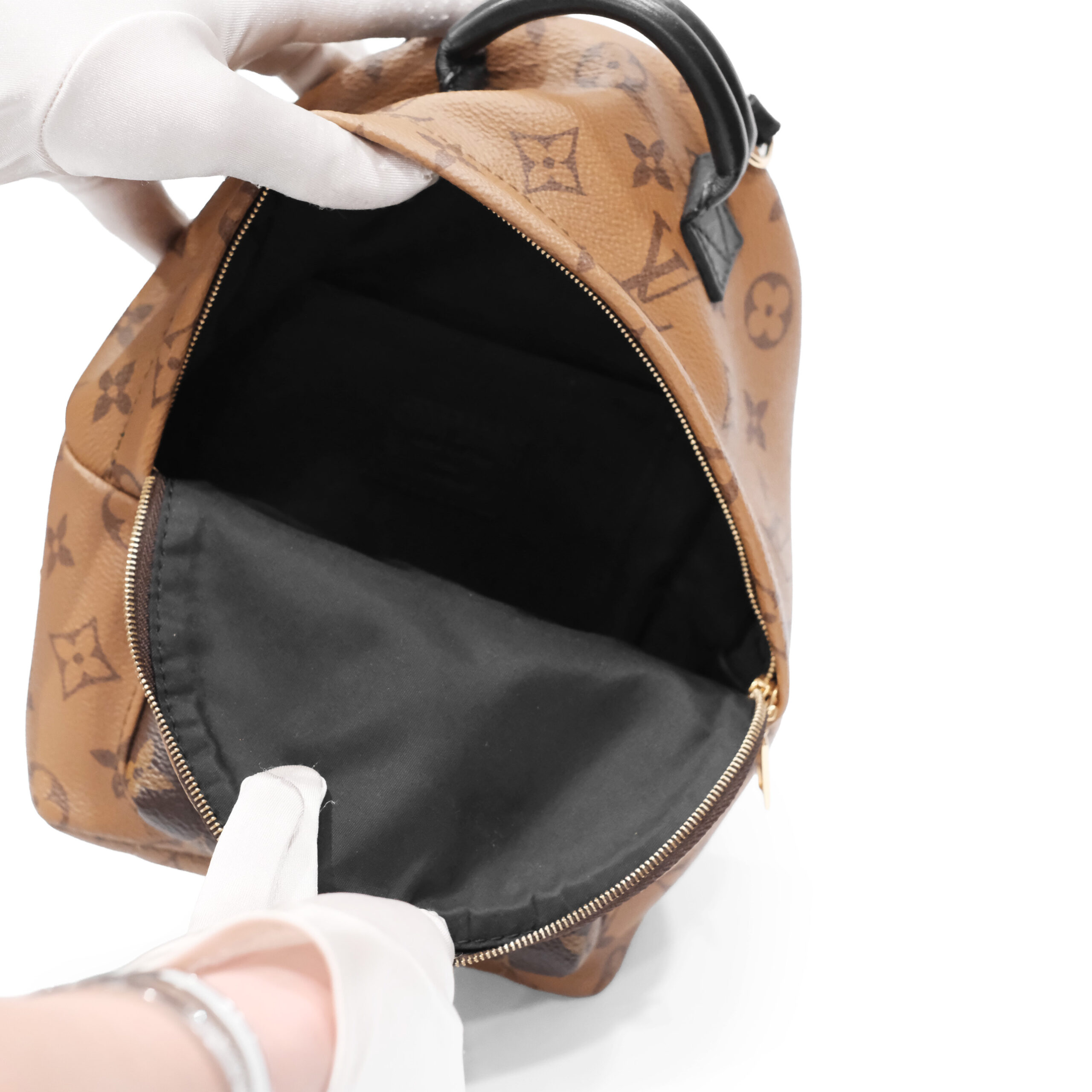 This is the authentic LOUIS VUITTON Reverse Monogram Palm Springs Backpack Mini. This petite backpack features a body of two-toned monogram coated canvas in light brown with a dark brown front pocket. The backpack is reinforced with black cowhide leather trim, including a top handle, long adjustable and removable shoulder straps, and a front zipper pocket. The wrap-around zipper opens to a black fabric interior with a patch pocket.