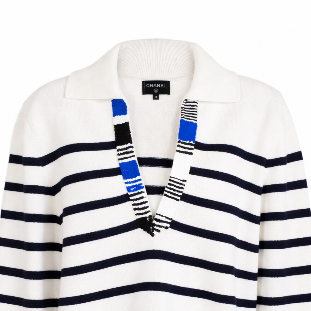 Capture the essence of Parisian chic with this unique and highly sought-after piece from the Chanel Spring/Summer 2024 Collection. This stunning white and navy striped sweater is more than just a basic; it’s a luxury statement that perfectly blends timeless nautical style with modern high-fashion details.