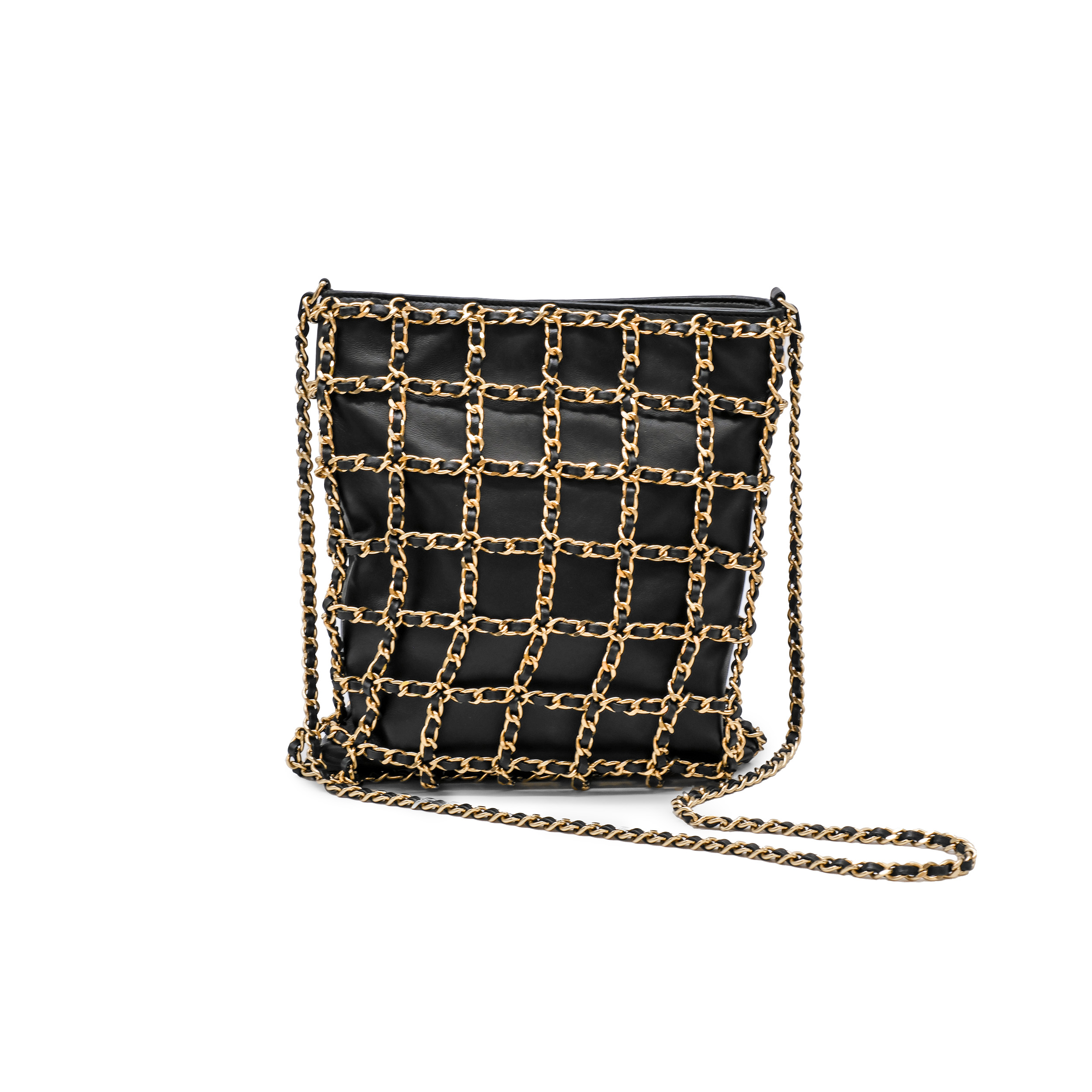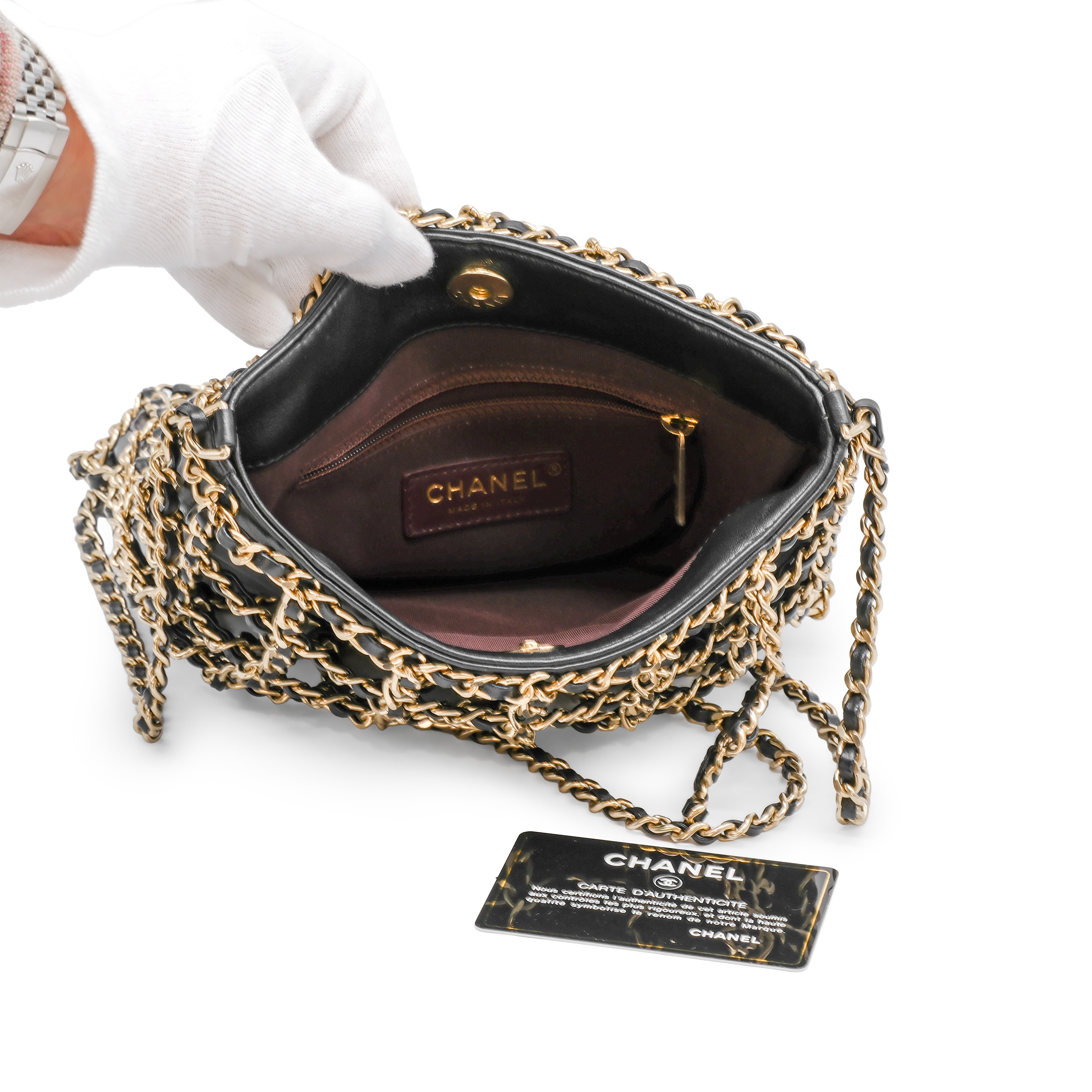 This tote bag features a lambskin leather body with chain details, leather woven chain straps, an open top with magnetic snap closure, and an interior zip pocket.