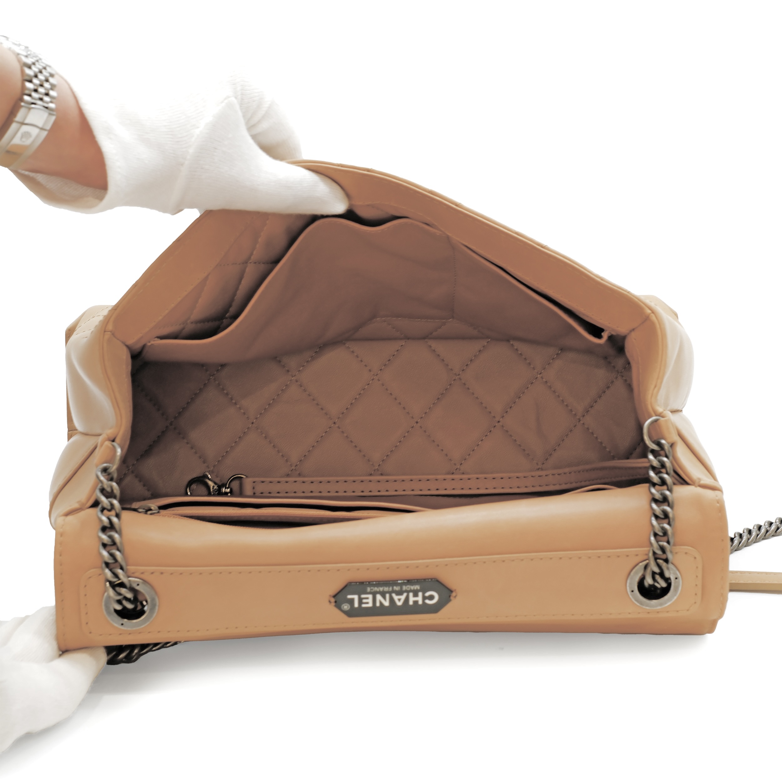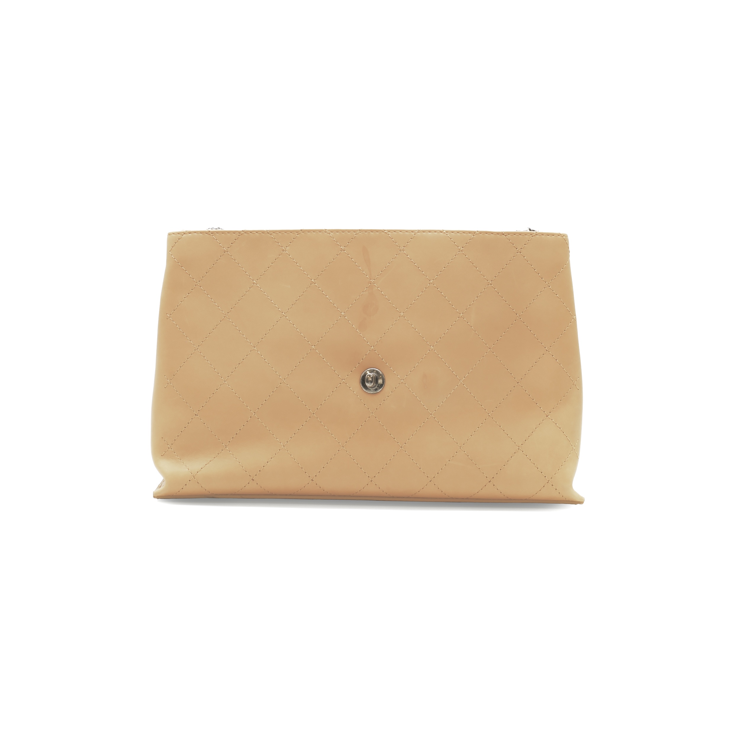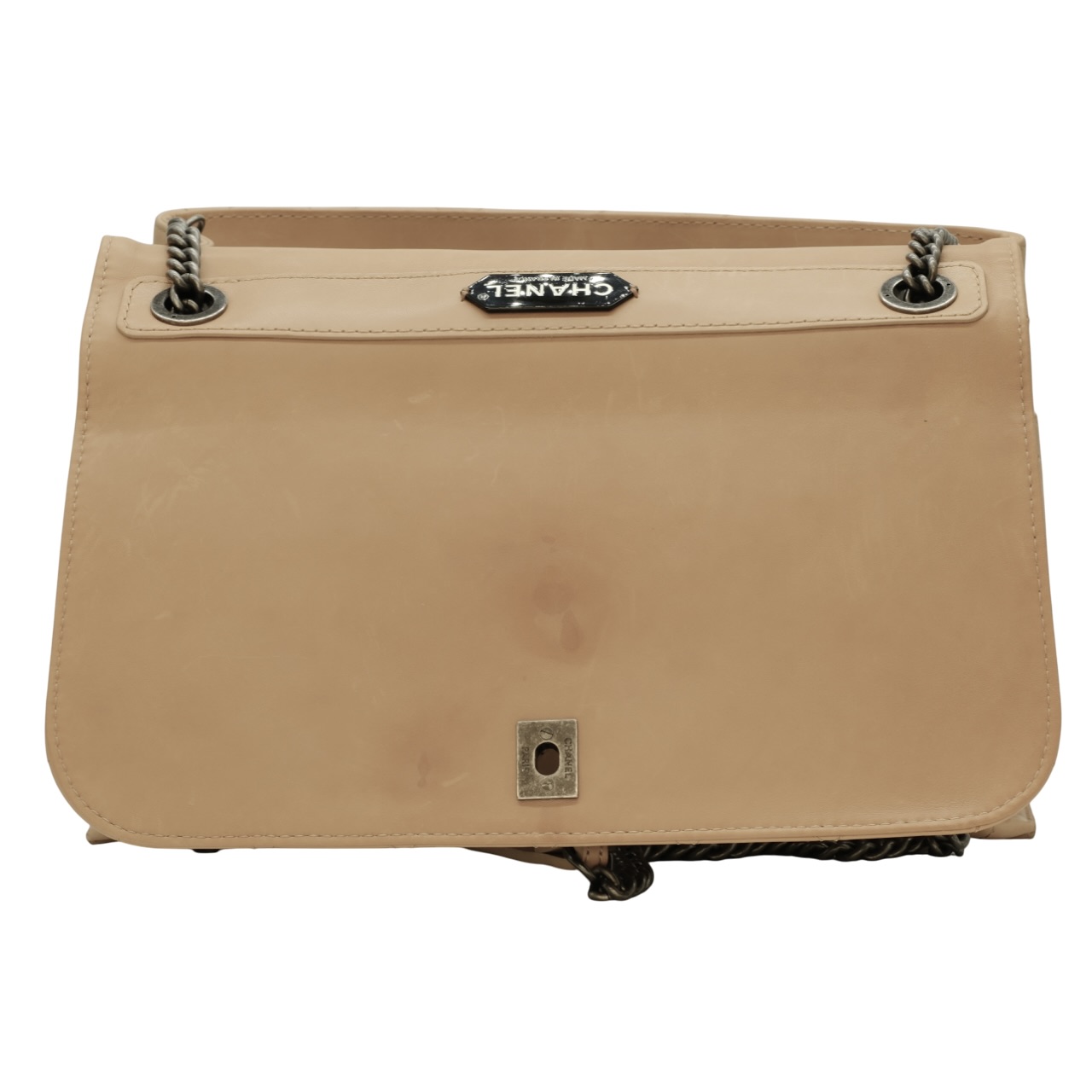 This satchel features a leather body, rolled leather top handle, chain strap with leather guard, a front flap with twist lock closure, and interior zip and slip pockets.