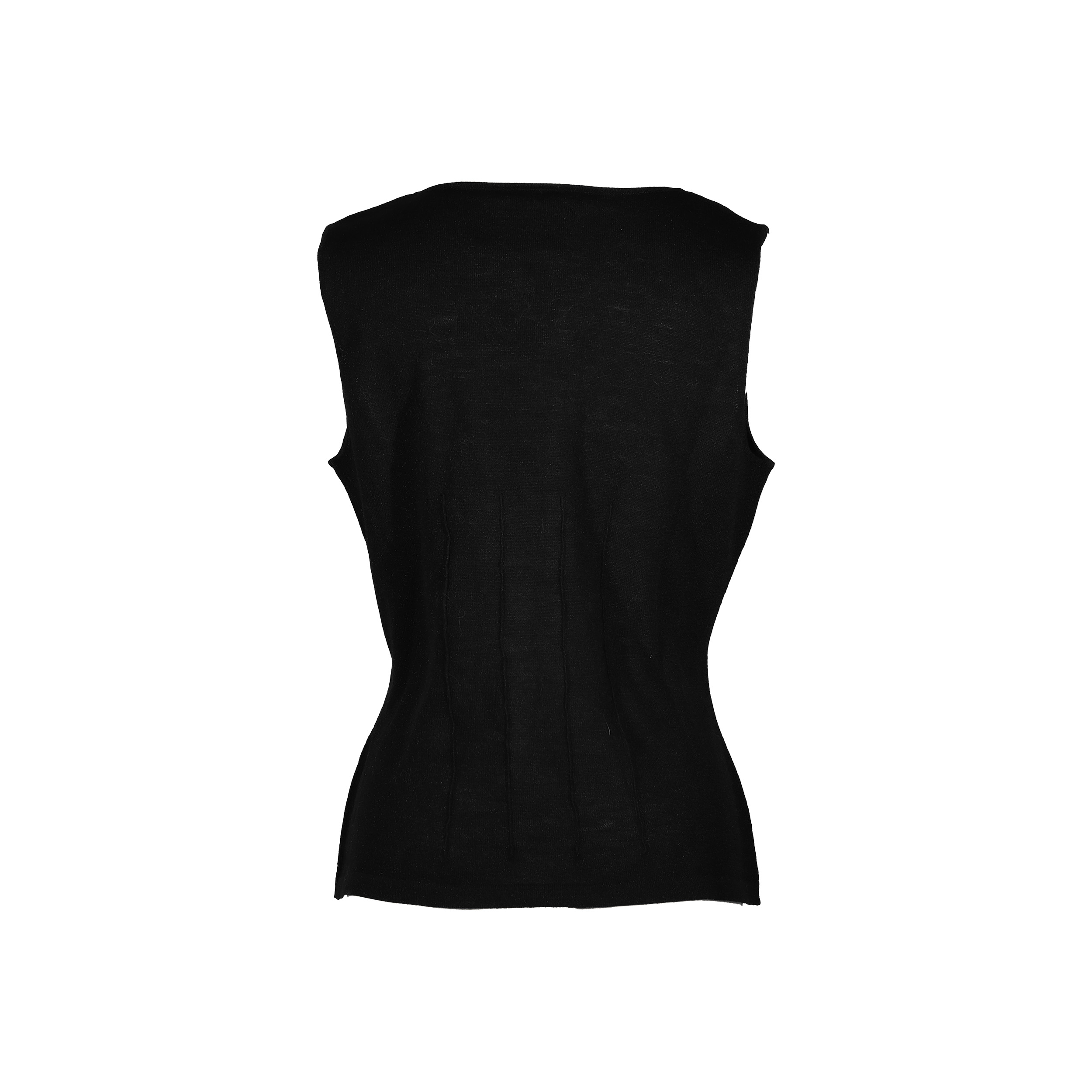 A timeless vintage piece from 1999, crafted from 79% wool for a soft, structured feel. This elegant black sleeveless top features a minimalist silhouette and subtle detailing, making it a versatile addition to any wardrobe. An iconic archival item that reflects classic late-90s design—perfect for collectors and lovers of authentic vintage fashion.