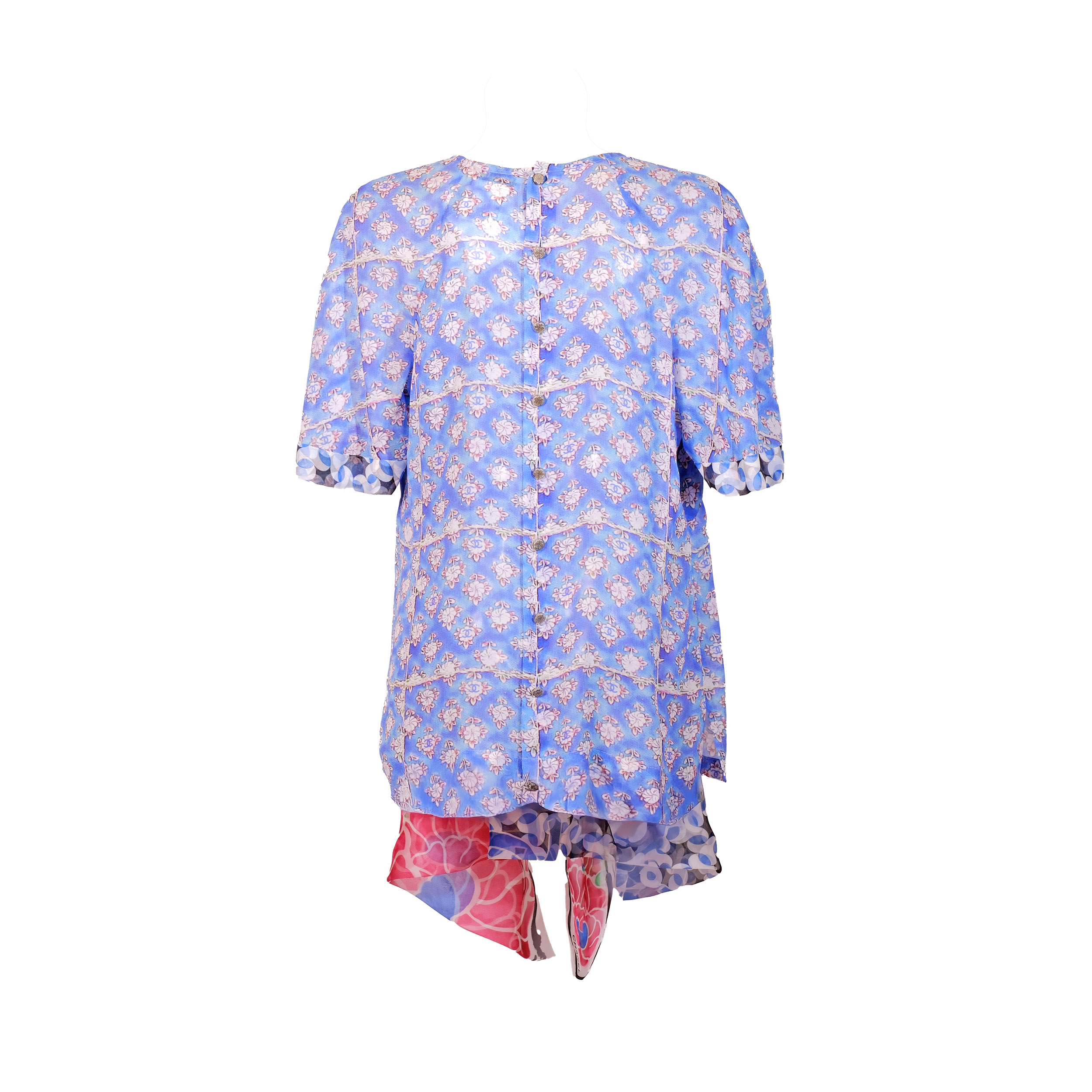 Elevate your curated wardrobe with this exquisite piece from Chanel. Crafted from 100% premium silk, this blouse features a delicate tonal blue mosaic print contrasted by a vibrant, oversized floral motif in fuchsia and violet tones at the center.